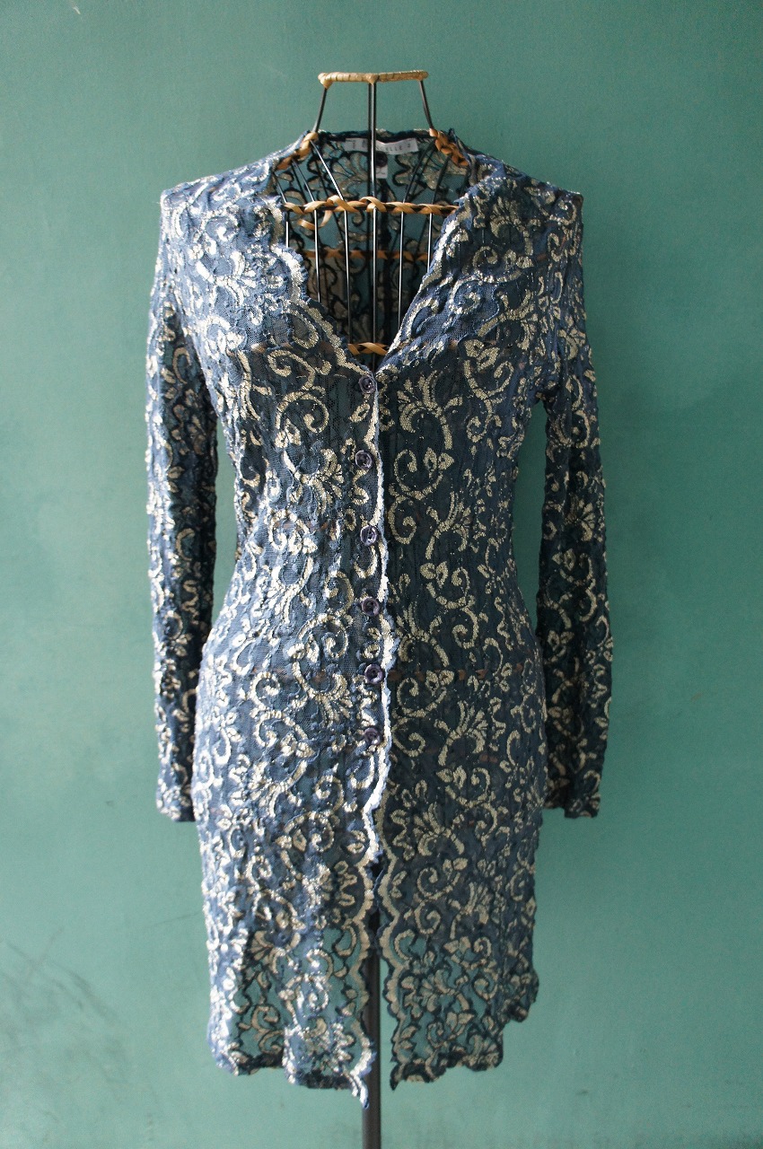深いブルーにゴールドの配色が綺麗な 総レースのロングシャツです