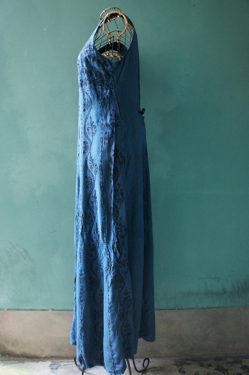 深いインディゴのブルーに 同色の刺繍が全面にほどこされ 一枚で雰囲気あるワンピースです