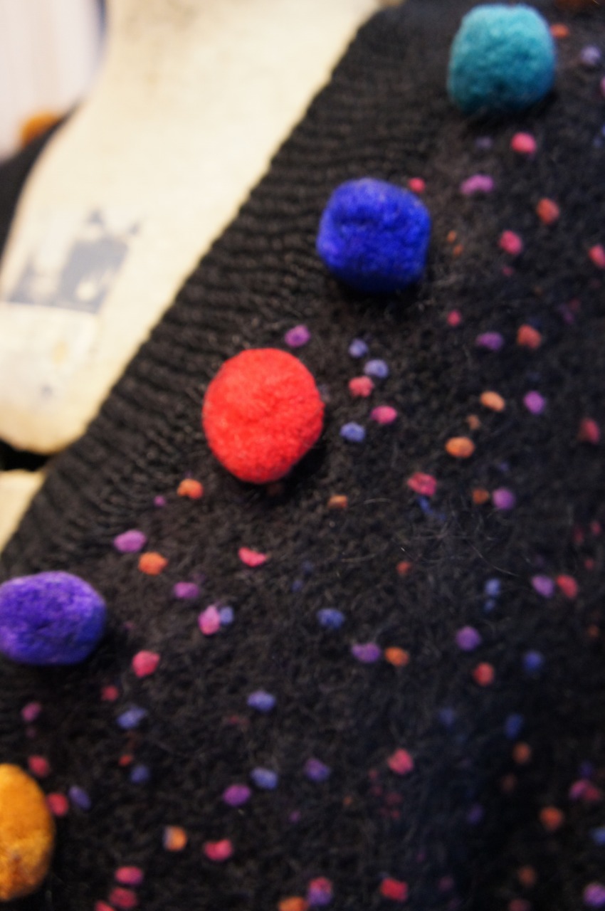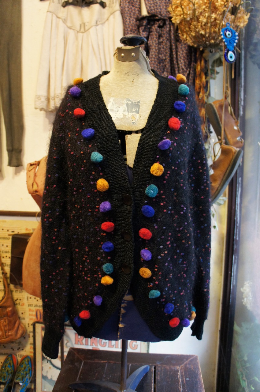 カラフルなポンポンがあしらわれた 80sモヘアニットカーディガンです