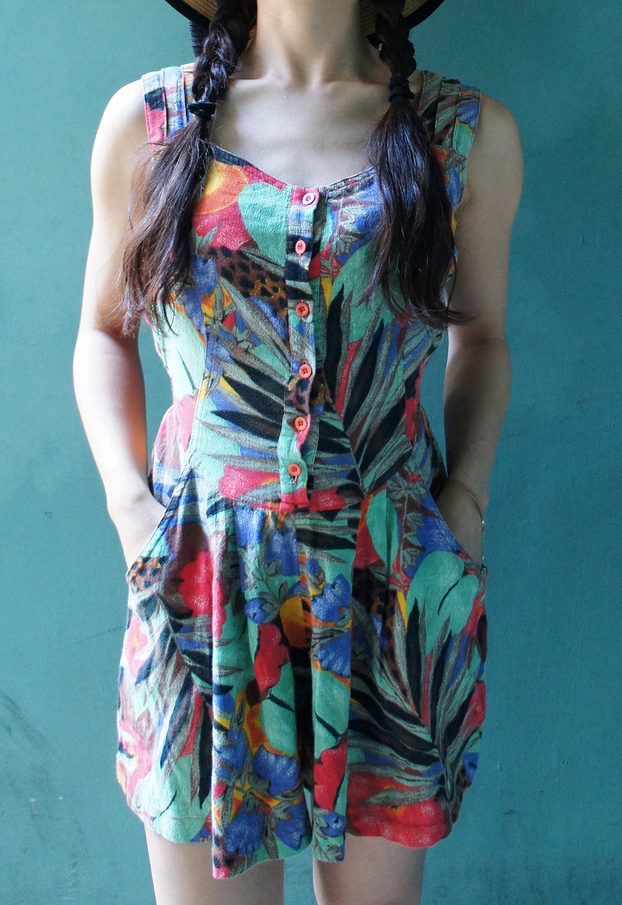 トロピカルな色合いと柄が可愛い usedサロペットです